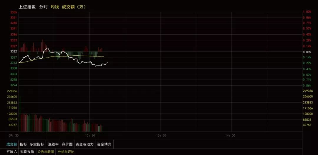 用股票软件打开上证指数分时图(如图所示),里面就会动态显示一些五颜六色的曲线、柱线以及一些数字。那么,怎么理解这些线条和数字呢?