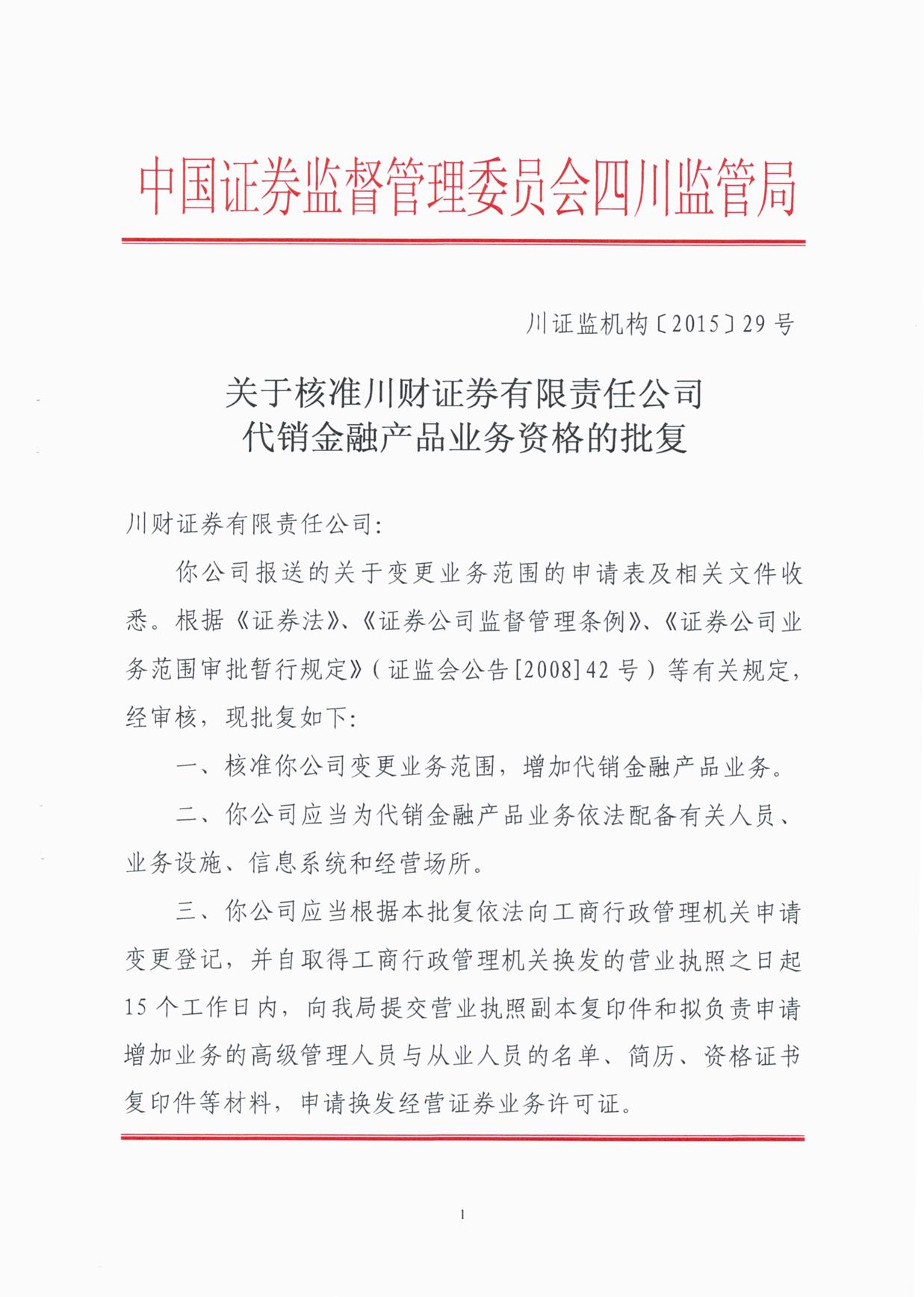 川证监机构[2015]29号-关于核准川财证券有限责任公司代销金融产品业务资格的批复 2020-11-23 18:59:06 川证监机构[2015]29号-关于核准川财证券有限责任公司代销金融产品业务资格的批复.pdf 阅读:loading... 【收藏此页】 【关闭窗口】 上一页 1 下一页
