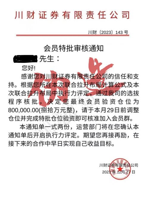 一、上述假冒川财证券发布的“会员特批审核通知”为伪造通知,发文字号、全文内容、落款盖章均为伪造;上述不法分子冒充我公司员工、冒用我司之名进行的所有宣传均为不实信息,所有荐股、咨询、诈骗等行为均与我公司无关。
